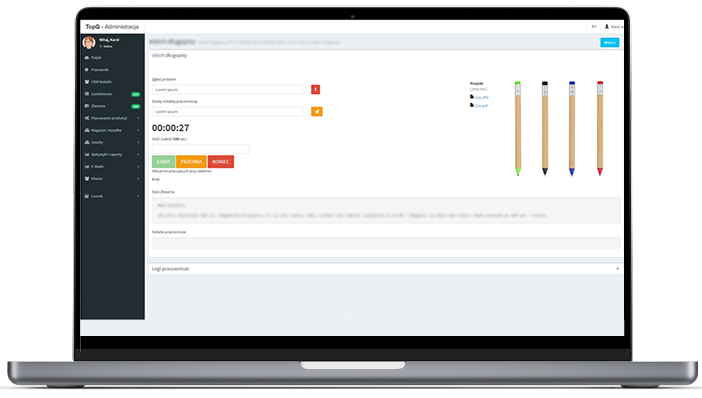 Firma TopQ realizuje na ogromną skalę nadruki na wszystkich artykułach i produktach reklamowych, tzn. druk na koszulkach, torbach, kubkach, parasolkach, bluzach, gadżetach, itp, hafty komputerowe na produktach tekstylnych, znakowanie oraz cięcie laserem tworzyw sztucznych. Mieliśmy przyjemność zrealizować system klasy MES do zarządzania produkcją w tej firmie. Obecnie korzysta z niego kilkadziesiąt osób i znacznie ułatwia to ich pracę.