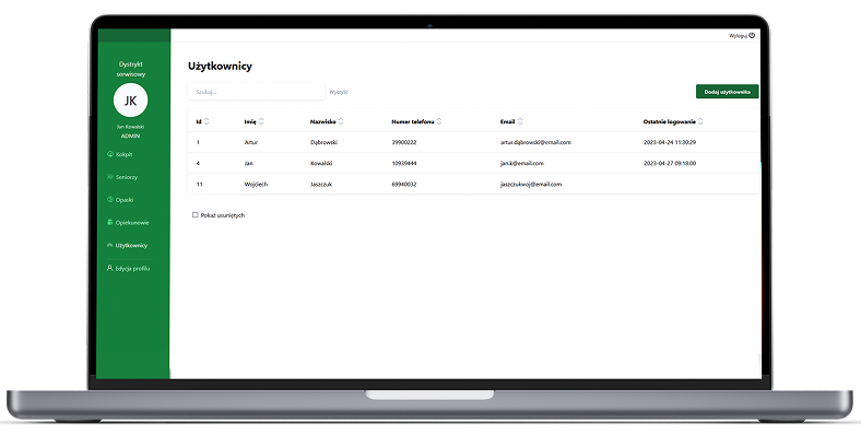 System oparty jest na architekturze klient-serwer z backendem w Laravelu i panelem administracyjnym zbudowanym w Inertia.js. Opiekun korzysta z aplikacji mobilnej, która umożliwia podgląd danych z zegarka seniora monitorującego funkcje życiowe. Informacje przesyłane są w czasie rzeczywistym, a system wspiera alerty SMS i push, zapewniając szybką reakcję w razie zagrożenia.